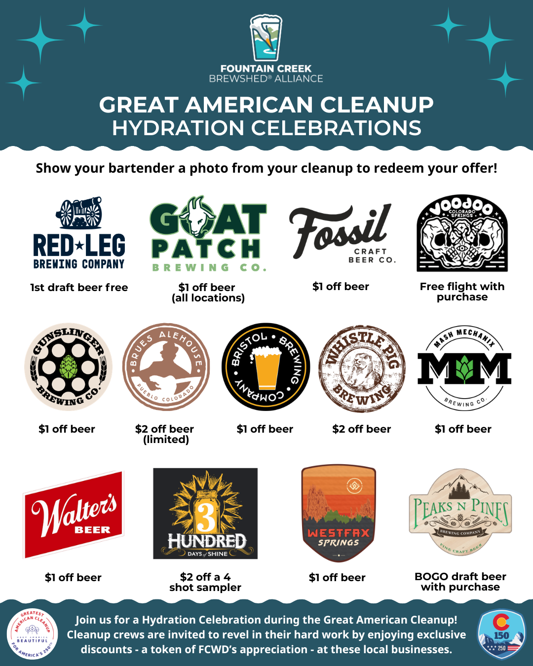 Join us for a Hydration Celebration after your Great American Cleanup! To redeem your offer, you MUST show your bartender a photo from your cleanup. Cleanup crews are invited to revel in their hard work by enjoying exclusive beer discounts - a token of FCWD’s appreciation - at these local breweries: